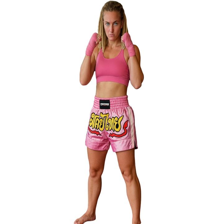 Short Thai / kickboxing en satin de haute qualité. Excellente traitement (fait à la main). Rose avec lettrage jaune sur le devant. Large ceinture élastique et grandes fentes latérales pour un confort optimal. Laçage à l'intérieur. Coupe spéciale pour les coups de pied haut et du genou.