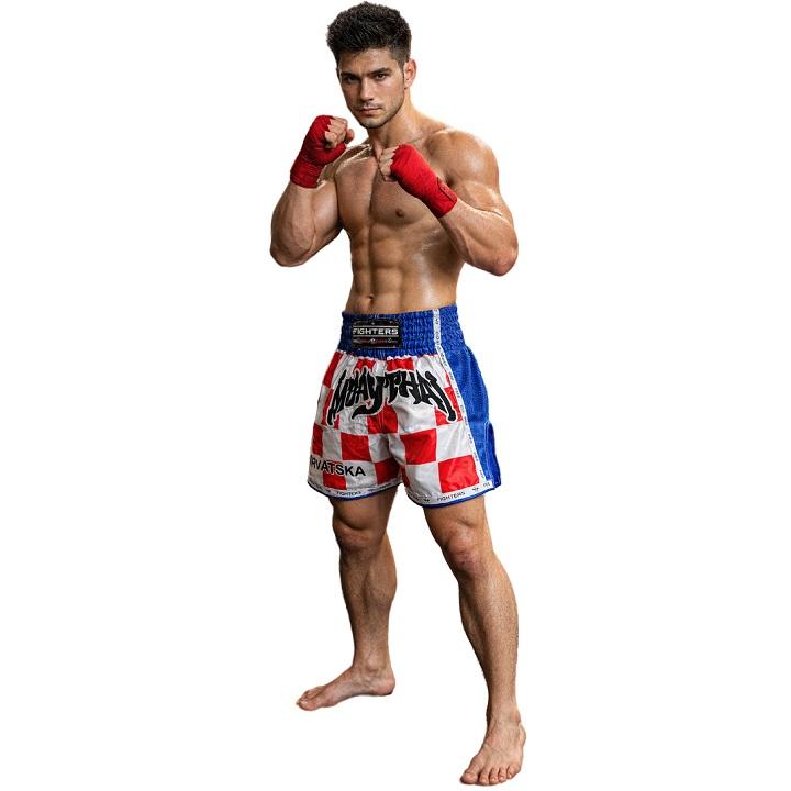 Short Kick / Thaiboxing en satin fin de haute qualité. Excellente finition (fait à la main). Pantalon thaïlandais blanc / rouge avec écusson de Croatie et inscription HRVATSKA. Large ceinture élastique et fentes latérales pour un confort parfait. Laçage à l'intérieur. Coupe spéciale pour les coups de pied et les rotules.