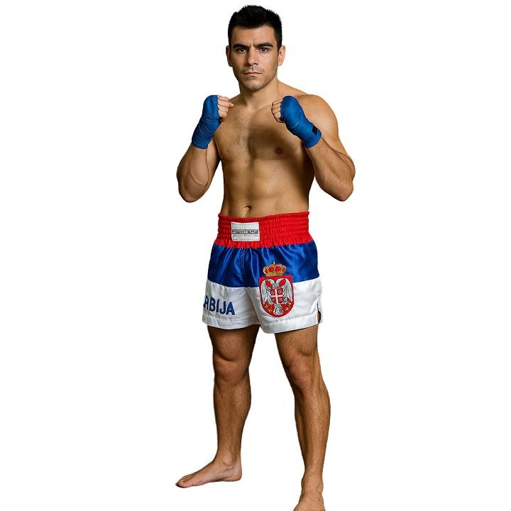 Short de boxe Thai / kick de haute qualité en satin. Excellente finition (fait main, satin fin). Short Thai rouge-bleu-blanc avec armoiries de la Serbie et l'inscription du SRBIJA. Avec large ceinture élastique, fentes latérales et laçage à l'intérieur pour un ajustement parfait. Coupe spéciale pour les coups de pied haut et knee kicks.