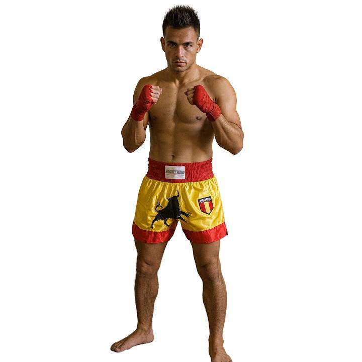 Short de boxe Thai / kick de haute qualité en satin. Excellente finition (fait main, satin fin). Short rouge / jaune avec armoiries d'espagnol et un taureau noir. Avec large ceinture élastique, fentes latérales et laçage à l'intérieur pour un ajustement parfait. Coupe spéciale pour les coups de pied haut et knee kicks.